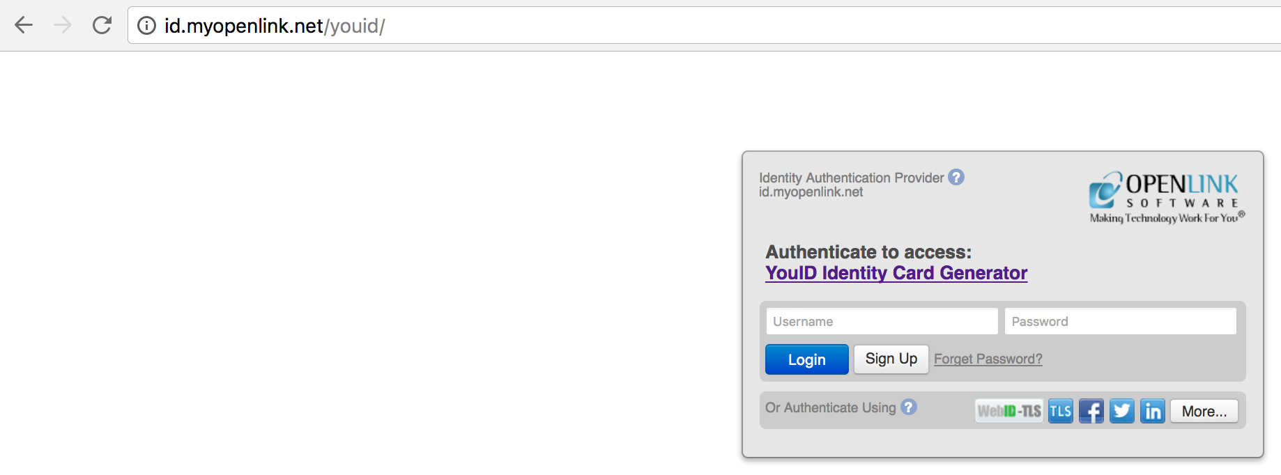 YouID certificate generation service ( http://id.myopenlink.net/youid/ ) in a Web Browser and login using one of the presented Single Sign on (SSO) services for Authentication (in this case we chose Facebook):