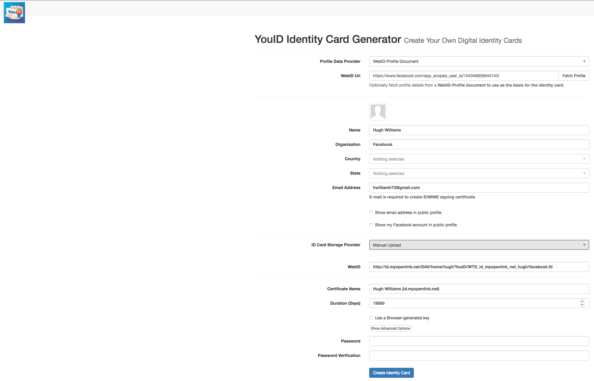 - The YouID Identity Card Generator page is presented: